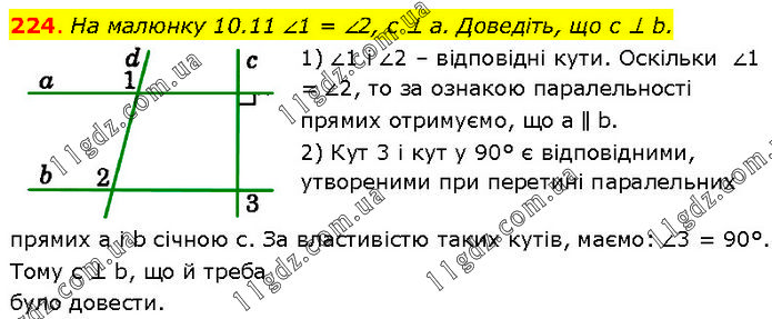 На малюнку 10.11 ∠1 = ∠2, с ⊥ а. Доведіть, що с ⊥ b. 1) ∠1 і ∠2 – відповідні кути. Оскільки ∠1 = ∠2, то за ознакою паралельності прямих отримуємо, що а ∥ b. 2) Кут 3 і кут у 90° є відповідними, утвореними при перетині паралельних прямих а і b січною с. За властивістю таких кутів, маємо: ∠3 = 90°. Тому с ⊥ b, що й треба було довести.
