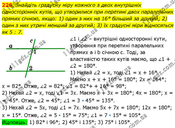 Знайдіть градусну міру кожного з двох внутрішніх односторонніх кутів, що утворилися при перетині двох паралельних прямих січною, якщо: 1) один з них на 16° більший за другий; 2) один з них утричі менший за другий; 3) їх градусні міри відносяться як 5 : 7. ∠1 і ∠2 – внутрішні односторонні кути, утворення при перетині паралельних прямих а і b січною c. Тоді, за властивістю таких кутів маємо, що ∠1 + ∠2 = 180°. 1) Нехай ∠2 = х, тоді ∠1 = х + 16°. Маємо х + х + 16° = 180°; 2х = 164°; х = 82°. Отже, ∠2 = 82°; ∠1 = 82°+ + 16° = 98°; 2) Нехай ∠2 = х, тоді ∠1 = 3х. Маємо х + 3х = 180°; 4х = 180°; х = = 45°. Отже, ∠2 = 45°; ∠1 = 3 ∙ 45° = 135°. 3) Нехай ∠2 = 5х, тоді ∠1 = 7х. Маємо 5х + 7х = 180°; 12х = 180°; х = 15°. Отже, ∠2 = 5 ∙ 15° = 75°; ∠1 = 7 ∙ 15° = 105°. Відповідь: 1) 82° і 96°; 2) 45° і 135°; 3) 75° і 105°.