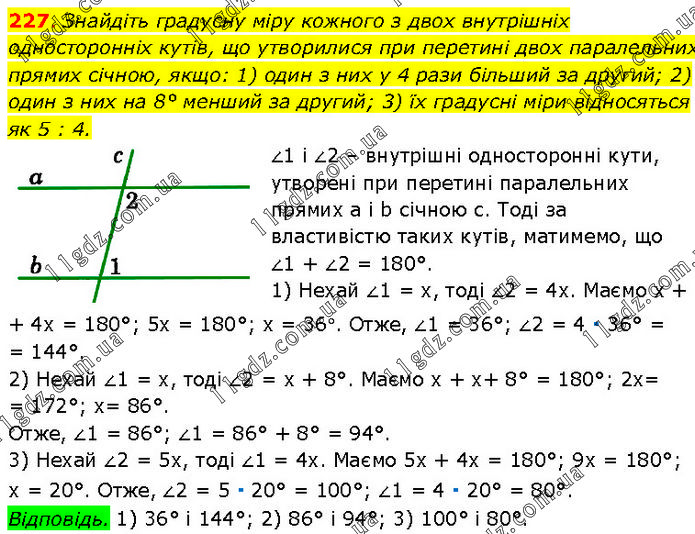 Знайдіть градусну міру кожного з двох внутрішніх односторонніх кутів, що утворилися при перетині двох паралельних прямих січною, якщо: 1) один з них у 4 рази більший за другий; 2) один з них на 8° менший за другий; 3) їх градусні міри відносяться як 5 : 4. ∠1 і ∠2 – внутрішні односторонні кути, утворені при перетині паралельних прямих а і b січною с. Тоді за властивістю таких кутів, матимемо, що ∠1 + ∠2 = 180°. 1) Нехай ∠1 = х, тоді ∠2 = 4х. Маємо х + + 4х = 180°; 5х = 180°; х = 36°. Отже, ∠1 = 36°; ∠2 = 4 ∙ 36° = = 144°. 2) Нехай ∠1 = х, τoдi ∠2 = х + 8°. Маємо х + х+ 8° = 180°; 2х= = 172°; х= 86°. Отже, ∠1 = 86°; ∠1 = 86° + 8° = 94°. 3) Нехай ∠2 = 5х, тоді ∠1 = 4х. Маємо 5х + 4х = 180°; 9х = 180°; х = 20°. Отже, ∠2 = 5 ∙ 20° = 100°; ∠1 = 4 ∙ 20° = 80°. Відповідь. 1) 36° і 144°; 2) 86° і 94°; 3) 100° і 80°.