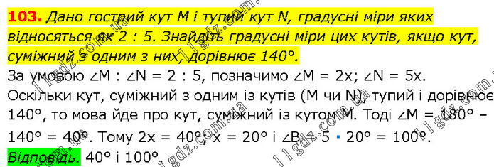 Дано гострий кут M і тупий кут N, градусні міри яких відносяться як 2 : 5. Знайдіть градусні міри цих кутів, якщо кут, суміжний з одним з них, дорівнює 140°. За умовою ∠M : ∠N = 2 : 5, позначимо ∠M = 2х; ∠N = 5х. Оскільки кут, суміжний з одним із кутів (M чи N), тупий і дорівнює 140°, то мова йде про кут, суміжний із кутом М. Тоді ∠М = 180° – 140° = 40°. Тому 2х = 40°; х = 20° і ∠B = 5 ∙ 20° = 100°. Відповідь. 40° і 100°.