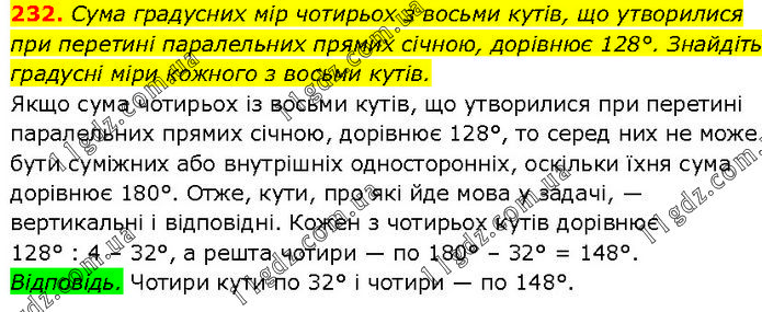 Сума градусних мір чотирьох з восьми кутів, що утворилися при перетині паралельних прямих січною, дорівнює 128°. Знайдіть градусні міри кожного з восьми кутів. Якщо сума чотирьох із восьми кутів, що утворилися при перетині паралельних прямих січною, дорівнює 128°, то серед них не може бути суміжних або внутрішніх односторонніх, оскільки їхня сума дорівнює 180°. Отже, кути, про які йде мова у задачі, — вертикальні і відповідні. Кожен з чотирьох кутів дорівнює 128° : 4 – 32°, а решта чотири — по 180° – 32° = 148°. Відповідь. Чотири кути по 32° і чотири — по 148°.