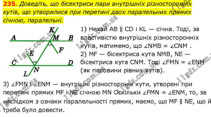 Доведіть, що бісектриси пари внутрішніх різносторонніх кутів, що утворилися при перетині двох паралельних прямих січною, паралельні. 1) Нехай AB ∥ CD і KL — січна. Тоді, за властивістю внутрішніх різносторонніх кутів, матимемо, що ∠NMB = ∠CNM . 2) MF — бісектриса кута NMB, NE — бісектриса кута CNM. Тоді ∠FMN = ∠ENM (як половини рівних кутів). 3) ∠FMN і ∠ENM — внутрішні різносторонні кути, утворені при перетині прямих MF і NE січною MN Оскільки ∠FMN = ∠ENM, то, за наслідком з ознаки паралельності прямих, маємо, що MF ∥ NE, що й треба було довести.
