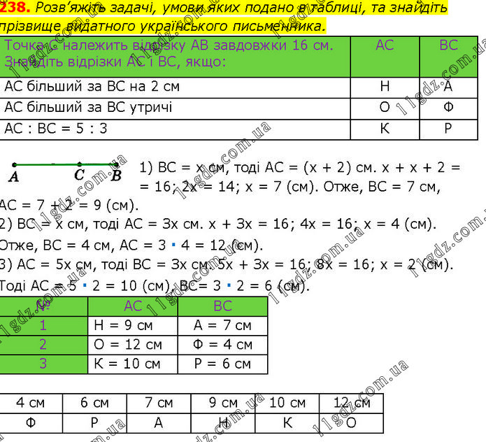 Розв’яжіть задачі, умови яких подано в таблиці, та знайдіть прізвище видатного українського письменника. 1) BC = х см, тоді AC = (х + 2) см. х + х + 2 = = 16; 2х = 14; х = 7 (см). Отже, BC = 7 см, AC = 7 + 2 = 9 (см). 2) BC = х см, тоді AC = Зх см. х + Зх = 16; 4х = 16; х = 4 (см). Отже, BC = 4 см, AC = 3 ∙ 4 = 12 (см). 3) AC = 5х см, тоді BC = Зх см. 5х + Зх = 16; 8х = 16; х = 2 (см). Тоді AC = 5 ∙ 2 = 10 (см), BC= 3 ∙ 2 = 6 (см).