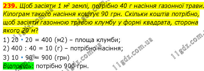 Щоб засіяти 1 м2 землі, потрібно 40 г насіння газонної трави. Кілограм такого насіння коштує 90 грн. Скільки коштів потрібно, щоб засіяти газонною травою клумбу у формі квадрата, сторона якого 20 м? 1) 20 ∙ 20 = 400 (м2) – площа клумби; 2) 400 : 40 = 10 (г) – потрібно насіння; 3) 10 ∙ 90 = 900 (грн) Відповідь: потрібно 900 грн.