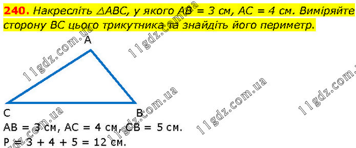 Накресліть △АВС, у якого AB = 3 см, AC = 4 см. Виміряйте сторону BC цього трикутника та знайдіть його периметр. АВ = 3 см, АС = 4 см, СВ = 5 см. Р = 3 + 4 + 5 = 12 см.