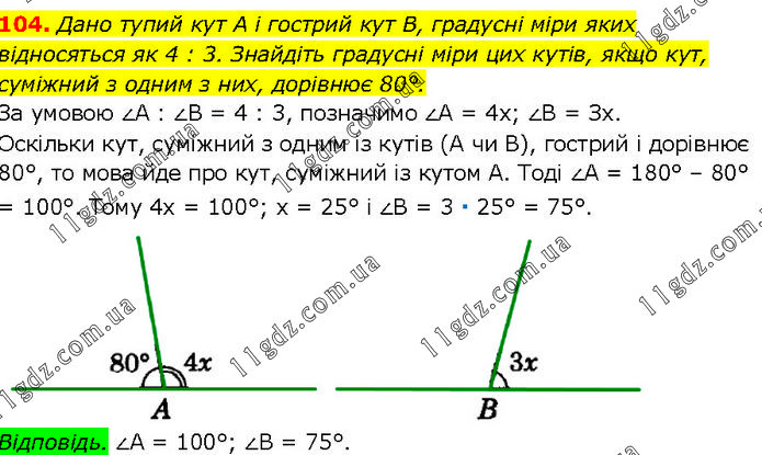 Дано тупий кут А і гострий кут В, градусні міри яких відносяться як 4 : 3. Знайдіть градусні міри цих кутів, якщо кут, суміжний з одним з них, дорівнює 80°. За умовою ∠A : ∠B = 4 : 3, позначимо ∠A = 4х; ∠B = Зх. Оскільки кут, суміжний з одним із кутів (А чи В), гострий і дорівнює 80°, то мова йде про кут, суміжний із кутом А. Тоді ∠A = 180° – 80° = 100°. Тому 4х = 100°; х = 25° і ∠B = 3 ∙ 25° = 75°. Відповідь. ∠A = 100°; ∠B = 75°.