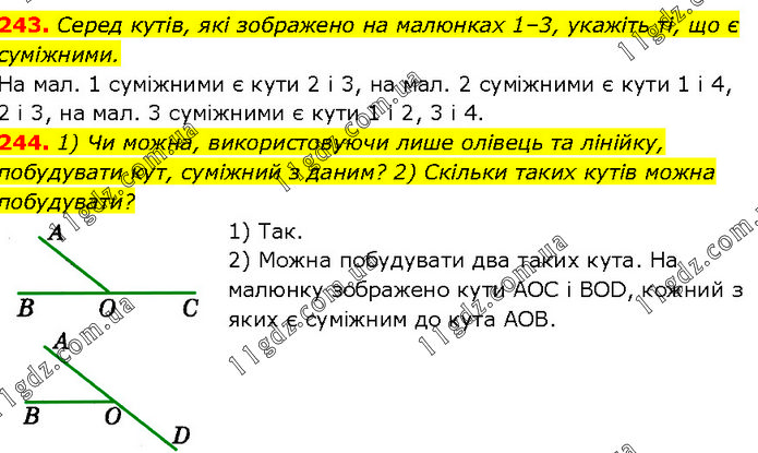 243. Серед кутів, які зображено на малюнках 1–3, укажіть ті, що є суміжними. На мал. 1 суміжними є кути 2 і 3, на мал. 2 суміжними є кути 1 і 4, 2 і 3, на мал. 3 суміжними є кути 1 і 2, 3 і 4. 244. 1) Чи можна, використовуючи лише олівець та лінійку, побудувати кут, суміжний з даним? 2) Скільки таких кутів можна побудувати? 1) Так. 2) Можна побудувати два таких кута. На малюнку зображено кути AOC і BOD, кожний з яких є суміжним до кута AOB.