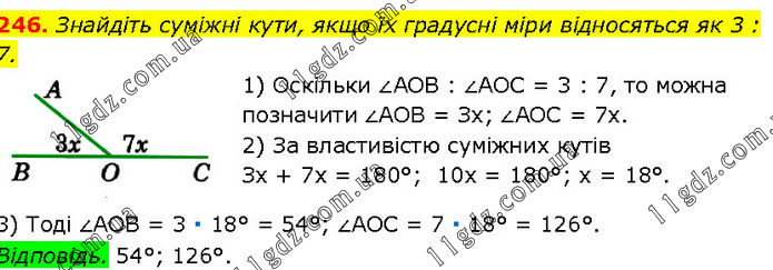 Знайдіть суміжні кути, якщо їх градусні міри відносяться як 3 : 7. 1) Оскільки ∠AOB : ∠AOC = 3 : 7, то можна позначити ∠AOB = Зх; ∠AOC = 7х. 2) За властивістю суміжних кутів Зх + 7x = 180°; 10x = 180°; х = 18°. 3) Тоді ∠AOB = 3 ∙ 18° = 54°; ∠AOC = 7 ∙ 18° = 126°. Відповідь. 54°; 126°.