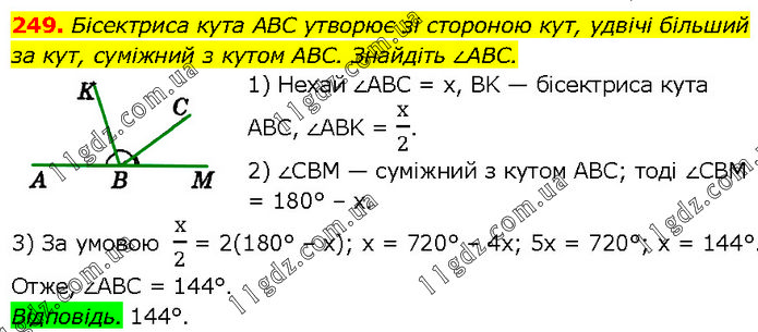 Бісектриса кута ABC утворює зі стороною кут, удвічі більший за кут, суміжний з кутом ABC. Знайдіть ∠ABC. 1) Нехай ∠ABC = х, BK — бісектриса кута ABC, ∠ABK = х/2. 2) ∠CBM — суміжний з кутом ABC; тоді ∠CBM = 180° – х. 3) За умовою х/2 = 2(180° – х); х = 720° – 4х; 5х = 720°; х = 144°. Отже, ∠ABC = 144°. Відповідь. 144°.