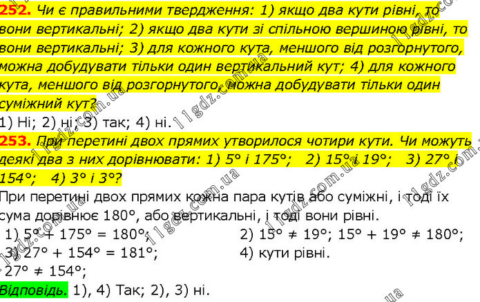 252. Чи є правильними твердження: 1) якщо два кути рівні, то вони вертикальні; 2) якщо два кути зі спільною вершиною рівні, то вони вертикальні; 3) для кожного кута, меншого від розгорнутого, можна добудувати тільки один вертикальний кут; 4) для кожного кута, меншого від розгорнутого, можна добудувати тільки один суміжний кут? 1) Ні; 2) ні; 3) так; 4) ні. 253. При перетині двох прямих утворилося чотири кути. Чи можуть деякі два з них дорівнювати: 1) 5° і 175°; 2) 15° і 19°; 3) 27° і 154°; 4) 3° і 3°? При перетині двох прямих кожна пара кутів або суміжні, і тоді їх сума дорівнює 180°, або вертикальні, і тоді вони рівні. 1) 5° + 175° = 180°; 3) 27° + 154° = 181°; 27° ≠ 154°; 2) 15° ≠ 19°; 15° + 19° ≠ 180°; 4) кути рівні. Відповідь. 1), 4) Так; 2), 3) ні.
