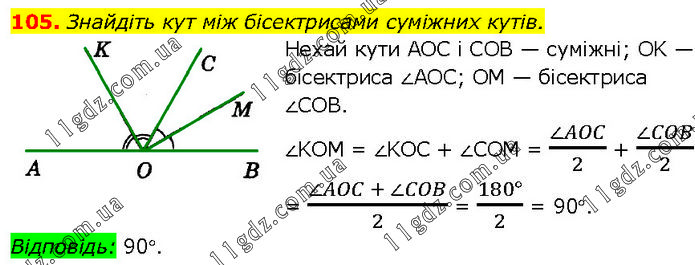 Знайдіть кут між бісектрисами суміжних кутів. Нехай кути AOC і COB — суміжні; OK — бісектриса ∠AOC; OM — бісектриса ∠COB. ∠KOM = ∠KOC + ∠COM = (∠AOC)/2 + (∠COB)/2 = (∠AOC + ∠COB)/2 = (180°)/2 = 90°. Відповідь: 90°.