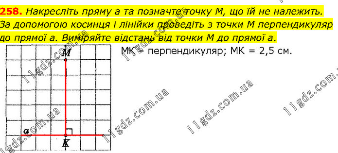 Накресліть пряму а та позначте точку М, що їй не належить. За допомогою косинця і лінійки проведіть з точки M перпендикуляр до прямої а. Виміряйте відстань від точки M до прямої а. МК – перпендикуляр; МК = 2,5 см.