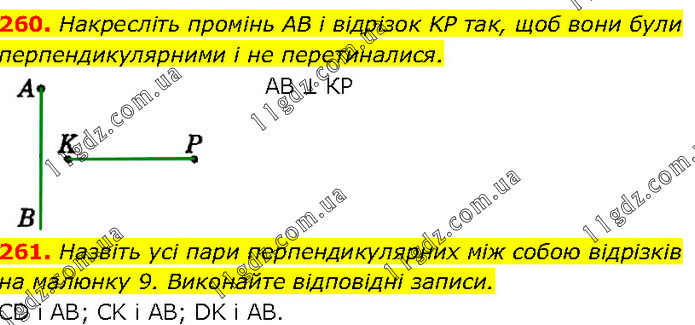 260. Накресліть промінь AB і відрізок KP так, щоб вони були перпендикулярними і не перетиналися. АВ ⊥ КР 261. Назвіть усі пари перпендикулярних між собою відрізків на малюнку 9. Виконайте відповідні записи. CD і AB; CK i AB; DK і AB.