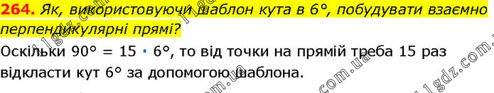 Як, використовуючи шаблон кута в 6°, побудувати взаємно перпендикулярні прямі? Оскільки 90° = 15 ∙ 6°, то від точки на прямій треба 15 раз відкласти кут 6° за допомогою шаблона.