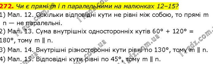 Чи є прямі m і n паралельними на малюнках 12–15? 1) Мал. 12. Оскільки відповідні кути не рівні між собою, то прямі m і n — не паралельні. 2) Мал. 13. Сума внутрішніх односторонніх кутів 60° + 120° = 180°, тому m ∥ n. 3) Мал. 14. Внутрішні різносторонні кути рівні по 130°, тому m ∥ n. 4) Мал. 15. Відповідні кути рівні по 45°, тому m ∥ n.