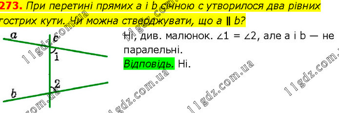 При перетині прямих а і b січною с утворилося два рівних гострих кути. Чи можна стверджувати, що а ∥ b? Ні, див. малюнок. ∠1 = ∠2, але а і b — не паралельні. Відповідь. Ні.
