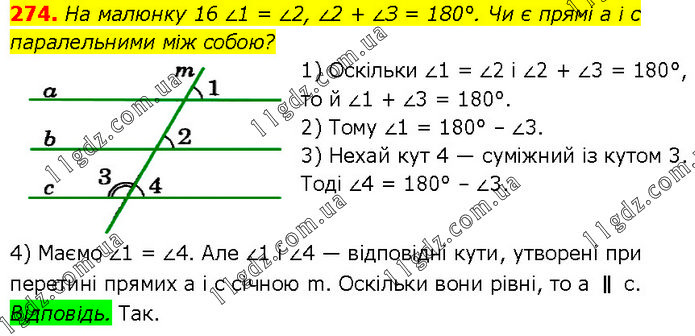 На малюнку 16 ∠1 = ∠2, ∠2 + ∠З = 180°. Чи є прямі а і с паралельними між собою? 1) Оскільки ∠1 = ∠2 і ∠2 + ∠3 = 180°, то й ∠1 + ∠3 = 180°. 2) Тому ∠1 = 180° – ∠3. 3) Нехай кут 4 — суміжний із кутом 3. Тоді ∠4 = 180° – ∠3. 4) Маємо ∠1 = ∠4. Але ∠1 і ∠4 — відповідні кути, утворені при перетині прямих а і с січною m. Оскільки вони рівні, то а ∥ с. Відповідь. Так.