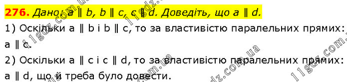 Дано: а ∥ b, b ∥ с, с ∥ d. Доведіть, що a ∥ d. 1) Оскільки a ∥ b і b ∥ с, то за властивістю паралельних прямих: а ∥ с. 2) Оскільки a ∥ с і c ∥ d, то за властивістю паралельних прямих: a ∥ d, що й треба було довести.