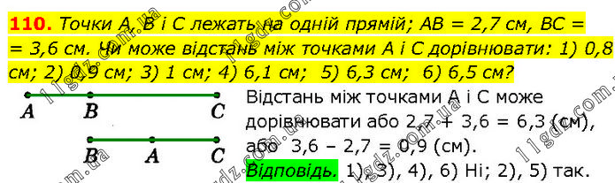 Точки А, В і C лежать на одній прямій; AB = 2,7 см, BC = = 3,6 см. Чи може відстань між точками А і C дорівнювати: 1) 0,8 см; 2) 0,9 см; 3) 1 см; 4) 6,1 см; 5) 6,3 см; 6) 6,5 см? Відстань між точками A і C може дорівнювати або 2,7 + 3,6 = 6,3 (см), або 3,6 – 2,7 = 0,9 (см). Відповідь. 1), 3), 4), 6) Ні; 2), 5) так.