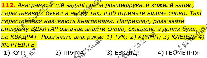 Анаграми. У цій задачі треба розшифрувати кожний запис, переставивши букви в ньому так, щоб отримати відоме слово. Такі перестановки називають анаграмами. Наприклад, розв’язати анаграму ВДАКТАР означає знайти слово, складене з даних букв, — це КВАДРАТ. Розв’яжіть анаграми: 1) ТУК; 2) АРЯМП; 3) КЛЕІВД; 4) МОРТЕІЯГЕ. 1) КУТ; 2) ПРЯМА; 3) ЕВКЛІД; 4) ГЕОМЕТРІЯ.