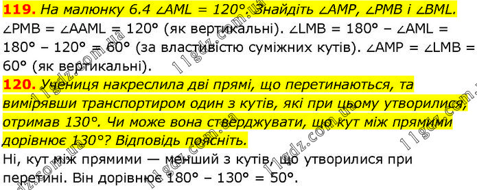 119. На малюнку 6.4 ∠AML = 120°. Знайдіть ∠AMP, ∠PMB і ∠BML. ∠PMB = ∠AAML = 120° (як вертикальні). ∠LMB = 180° – ∠AML = 180° – 120° = 60° (за властивістю суміжних кутів). ∠AMP = ∠LMB = 60° (як вертикальні). 120. Учениця накреслила дві прямі, що перетинаються, та вимірявши транспортиром один з кутів, які при цьому утворилися, отримав 130°. Чи може вона стверджувати, що кут між прямими дорівнює 130°? Відповідь поясніть. Ні, кут між прямими — менший з кутів, що утворилися при перетині. Він дорівнює 180° – 130° = 50°.