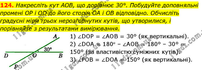 Накресліть кут AOB, що дорівнює 30°. Побудуйте доповняльні промені OP і OD до його сторін OA і OB відповідно. Обчисліть градусні міри трьох нерозгорнутих кутів, що утворилися, і порівняйте з результатами вимірювання. 1) ∠DOP = ∠AOB = 30° (як вертикальні). 2) ∠DOA = 180° – ∠AOB = 180° – 30° = 150° (за властивістю суміжних кутів). 3) ∠POB = ∠DOA = 150° (як вертикальні).