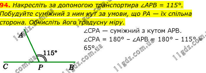 Накресліть за допомогою транспортира ∠APB = 115°. Побудуйте суміжний з ним кут за умови, що PA — їх спільна сторона. Обчисліть його градусну міру. ∠CPA — суміжний з кутом APB. ∠CPA = 180° – ∠APB = 180° – 115° = 65°.