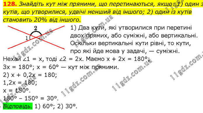 Знайдіть кут між прямими, що перетинаються, якщо: 1) один з кутів, що утворилися, удвічі менший від іншого; 2) один із кутів становить 20% від іншого. 1) Два кути, які утворилися при перетині двох прямих, або суміжні, або вертикальні. Оскільки вертикальні кути рівні, то кути, про які йде мова у задачі, — суміжні. Нехай ∠1 = x, тоді ∠2 = 2х. Маємо х + 2х = 180°; Зх = 180°; х = 60° — кут між прямими. 2) х + 0,2х = 180; 1,2х = 180; х = 150°. 180° – 150° = 30°. Відповідь. 1) 60°; 2) 30°.