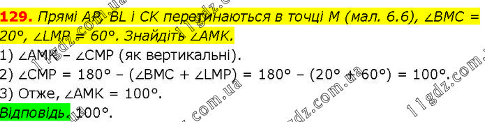 Прямі АР, BL і CK перетинаються в точці М (мал. 6.6), ∠BMC = 20°, ∠LMP = 60°. Знайдіть ∠AMK. 1) ∠AMK – ∠CMP (як вертикальні). 2) ∠CMP = 180° – (∠BMC + ∠LMP) = 180° – (20° + 60°) = 100°. 3) Отже, ∠AMK = 100°. Відповідь. 100°.