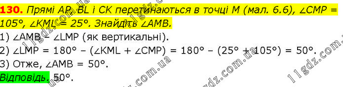 Прямі АР, BL і CK перетинаються в точці М (мал. 6.6), ∠CMP = 105°, ∠KML = 25°. Знайдіть ∠AMB. 1) ∠AMB – ∠LMP (як вертикальні). 2) ∠LMP = 180° – (∠KML + ∠CMP) = 180° – (25° + 105°) = 50°. 3) Отже, ∠AMB = 50°. Відповідь. 50°.