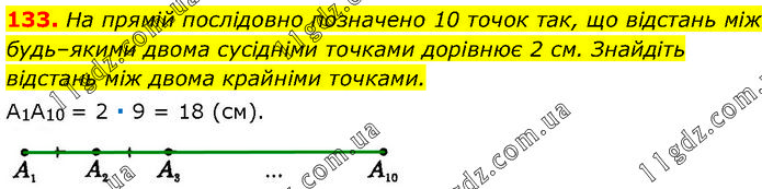 На прямій послідовно позначено 10 точок так, що відстань між будь–якими двома сусідніми точками дорівнює 2 см. Знайдіть відстань між двома крайніми точками. А1А10 = 2 ∙ 9 = 18 (см).
