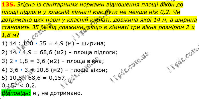 Згідно із санітарними нормами відношення площі вікон до площі підлоги у класній кімнаті має бути не менше ніж 0,2. Чи дотримано цих норм у класній кімнаті, довжина якої 14 м, а ширина становить 35 % від довжини, якщо в кімнаті три вікна розміром 2 х 1,8 м? 1) 14 : 100 ∙ 35 = 4,9 (м) – ширина; 2) 14 ∙ 4,9 = 68,6 (м2) – площа підлоги; 3) 2 ∙ 1,8 = 3,6 (м2) – площа вікна; 4) 3,6 ∙ 3 = 10,8 (м2) – площа вікон; 5) 10,8 : 68,6 = 0,157. 0,157 < 0,2. Відповідь: ні, не дотримано.