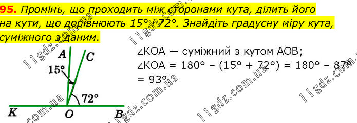 Промінь, що проходить між сторонами кута, ділить його на кути, що дорівнюють 15° і 72°. Знайдіть градусну міру кута, суміжного з даним. ∠KOA — суміжний з кутом AOB; ∠KOA = 180° – (15° + 72°) = 180° – 87° = 93°.