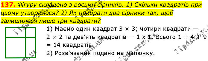 Фігуру складено з восьми сірників. 1) Скільки квадратів при цьому утворилося? 2) Як прибрати два сірники так, щоб залишилося лише три квадрати? 1) Маємо один квадрат 3 × 3; чотири квадрати — 2 × 2 та дев’ять квадратів — 1 x 1. Всього 1 + 4 + 9 = 14 квадратів. 2) Розв’язання подано на малюнку.
