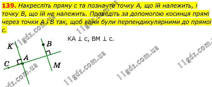 Накресліть пряму с та позначте точку А, що їй належить, і точку В, що їй не належить. Проведіть за допомогою косинця прямі через точки A i B так, щоб вони були перпендикулярними до прямої с. KA ⊥ c, BM ⊥ c.