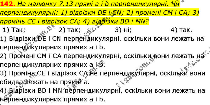 На малюнку 7.13 прямі а і b перпендикулярні. Чи перпендикулярні: 1) відрізки DE і CN; 2) промені CM і CA; 3) промінь CE і відрізок CA; 4) відрізки BD і MN? 1) Так; 2) так; 3) ні; 4) так. 1) Відрізки DЕ і СN перпендикулярні, оскільки вони лежать на перпендикулярних прямих а і b. 2) Промені СМ і СА перпендикулярні, оскільки вони лежать на перпендикулярних прямих a і b. 3) Промінь СЕ і відрізок СА не перпендикулярні, оскільки вони обидва лежать на прямій а. 4) Відрізки ВD і МN перпендикулярні, оскільки вони лежать на перпендикулярних прямих а і b.