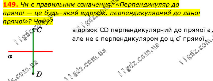 Чи є правильним означення: «Перпендикуляр до прямої — це будь–який відрізок, перпендикулярний до даної прямої»? Чому? відрізок CD перпендикулярний до прямої а, але не є перпендикуляром до цієї прямої.