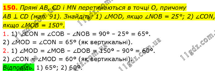 Прямі AB, CD і MN перетинаються в точці О, причому AB ⊥ CD (мал. 91). Знайдіть: 1) ∠MOD, якщо ∠NOB = 25°; 2) ∠CON, якщо ∠MOB = 150°. 1. 1) ∠CON = ∠COB – ∠NOB = 90° – 25° = 65°. 2) ∠MOD = ∠CON = 65° (як вертикальні). 2. 1) ∠MOD = ∠МОВ – ∠DOB = 150° – 90° = 60°. 2) ∠CON = ∠MOD = 60° (як вертикальні). Відповідь. 1) 65°; 2) 60°.