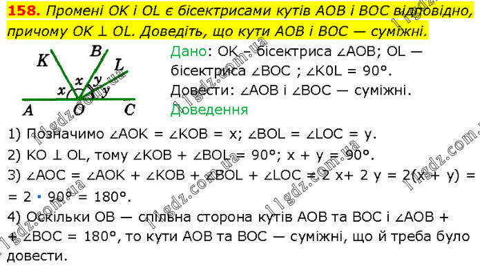 Промені OK і OL є бісектрисами кутів AOB і BOC відповідно, причому OK ⊥ OL. Доведіть, що кути AOB і BOC — суміжні. Дано: OK – бісектриса ∠AOB; OL — бісектриса ∠BOC ; ∠K0L = 90°. Довести: ∠AOB і ∠BOC — суміжні. Доведення 1) Позначимо ∠AOK = ∠KOB = х; ∠BOL = ∠LOC = у. 2) KO ⊥ OL, тому ∠KOB + ∠BOL = 90°; х + у = 90°. 3) ∠AOC = ∠AOK + ∠KOB + ∠BOL + ∠LOC = 2 x+ 2 y = 2(x + y) = = 2 ∙ 90° = 180°. 4) Оскільки OB — спільна сторона кутів AOB та BOC і ∠AOB + + ∠BOC = 180°, то кути AOB та BOC — суміжні, що й треба було довести.