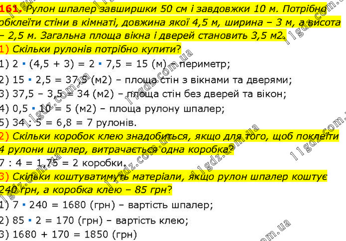 Рулон шпалер завширшки 50 см і завдовжки 10 м. Потрібно обклеїти стіни в кімнаті, довжина якої 4,5 м, ширина – 3 м, а висота – 2,5 м. Загальна площа вікна і дверей становить 3,5 м2. 1) Скільки рулонів потрібно купити? 1) 2 ∙ (4,5 + 3) = 2 ∙ 7,5 = 15 (м) – периметр; 2) 15 ∙ 2,5 = 37,5 (м2) – площа стін з вікнами та дверями; 3) 37,5 – 3,5 = 34 (м2) – площа стін без дверей та вікон; 4) 0,5 ∙ 10 = 5 (м2) – площа рулону шпалер; 5) 34 : 5 = 6,8 = 7 рулонів. 2) Скільки коробок клею знадобиться, якщо для того, щоб поклеїти 4 рулони шпалер, витрачається одна коробка? 7 : 4 = 1,75 = 2 коробки. 3) Скільки коштуватимуть матеріали, якщо рулон шпалер коштує 240 грн, а коробка клею – 85 грн? 1) 7 ∙ 240 = 1680 (грн) – вартість шпалер; 2) 85 ∙ 2 = 170 (грн) – вартість клею; 3) 1680 + 170 = 1850 (грн)
