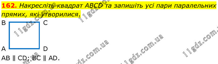 Накресліть квадрат ABCD та запишіть усі пари паралельних прямих, які утворилися. В С А D AB ∥ CD; BC ∥ AD.