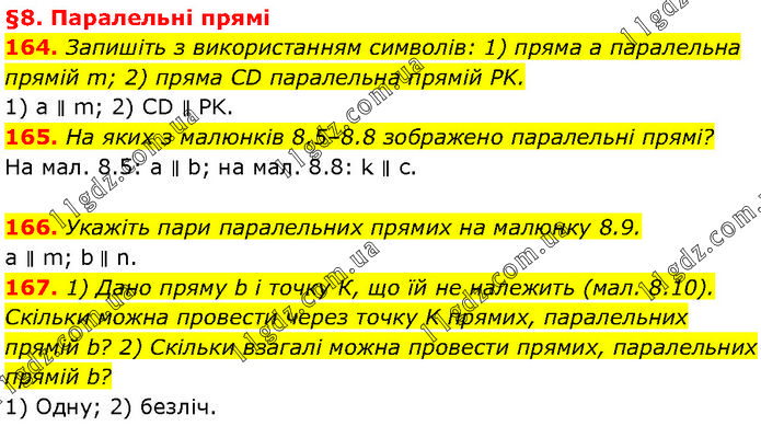 164. Запишіть з використанням символів: 1) пряма а паралельна прямій m; 2) пряма CD паралельна прямій PK. 1) a ∥ m; 2) CD ∥ PK. 165. На яких з малюнків 8.5–8.8 зображено паралельні прямі? На мал. 8.5: а ∥ b; на мал. 8.8: k ∥ с. 166. Укажіть пари паралельних прямих на малюнку 8.9. a ∥ m; b ∥ n. 167. 1) Дано пряму b і точку К, що їй не належить (мал. 8.10). Скільки можна провести через точку K прямих, паралельних прямій b? 2) Скільки взагалі можна провести прямих, паралельних прямій b? 1) Одну; 2) безліч.