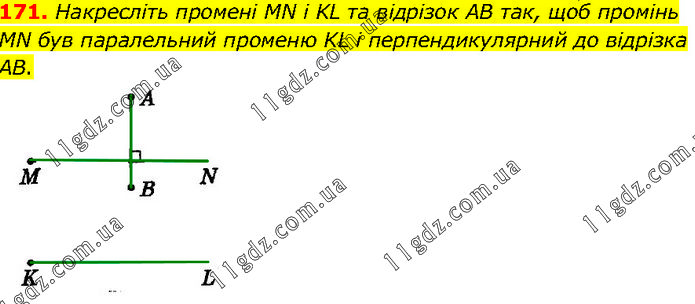 Накресліть промені MN і KL та відрізок AB так, щоб промінь MN був паралельний променю KL і перпендикулярний до відрізка AB.