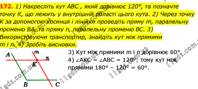 1) Накресліть кут ABC , який дорівнює 120°, та позначте точку К, що лежить у внутрішній області цього кута. 2) Через точку K за допомогою косинця і лінійки проведіть пряму m, паралельну променю BA, та пряму n, паралельну променю BC. 3) Використовуючи транспортир, знайдіть кут між прямими m і n. 4) Зробіть висновки. 3) Кут між прямими m і n дорівнює 60°. 4) ∠AKC = ∠ABC = 120°; тому кут між прямими 180° – 120° = 60°.