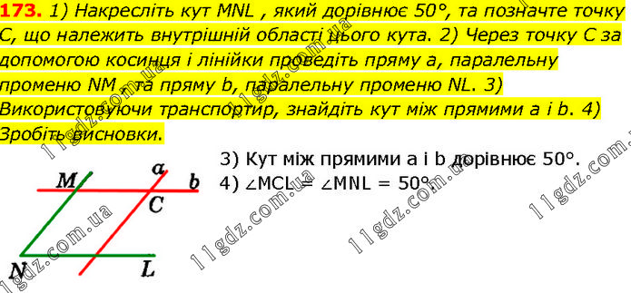 1) Накресліть кут MNL , який дорівнює 50°, та позначте точку С, що належить внутрішній області цього кута. 2) Через точку C за допомогою косинця і лінійки проведіть пряму а, паралельну променю NM , та пряму b, паралельну променю NL. 3) Використовуючи транспортир, знайдіть кут між прямими а і b. 4) Зробіть висновки. 3) Кут між прямими а і b дорівнює 50°. 4) ∠MCL = ∠MNL = 50°.