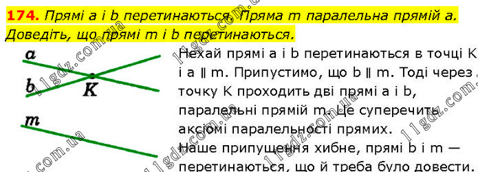 Прямі a i b перетинаються. Пряма m паралельна прямій а. Доведіть, що прямі m і b перетинаються. Нехай прямі а і b перетинаються в точці K і а ∥ m. Припустимо, що b ∥ m. Тоді через точку K проходить дві прямі а і b, паралельні прямій m. Це суперечить аксіомі паралельності прямих. Наше припущення хибне, прямі b і m — перетинаються, що й треба було довести.