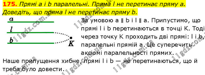 Прямі а і b паралельні. Пряма l не перетинає пряму а. Доведіть, що пряма l не перетинає пряму b. За умовою a ∥ b і l ∥ а. Припустимо, що прямі l і b перетинаються в точці К. Тоді через точку K проходить дві прямі: l і b, паралельні прямій а. Це суперечить аксіомі паралельності прямих. Наше припущення хибне, прямі l і b — не перетинаються, що й треба було довести.