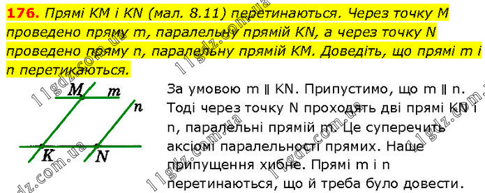 Прямі KM і KN (мал. 8.11) перетинаються. Через точку M проведено пряму m, паралельну прямій KN, а через точку N проведено пряму n, паралельну прямій KM. Доведіть, що прямі m і n перетикаються. За умовою m ∥ KN. Припустимо, що m ∥ n. Тоді через точку N проходять дві прямі KN і n, паралельні прямій m. Це суперечить аксіомі паралельності прямих. Наше припущення хибне. Прямі m i n перетинаються, що й треба було довести.