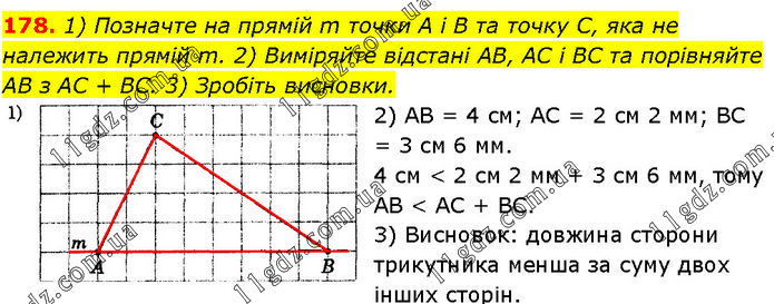 1) Позначте на прямій m точки А і В та точку С, яка не належить прямій m. 2) Виміряйте відстані AB, AC і BC та порівняйте AB з AC + BC. 3) Зробіть висновки. 2) AB = 4 см; AC = 2 см 2 мм; BC = 3 см 6 мм. 4 см < 2 см 2 мм + 3 см 6 мм, тому AB < AC + BC. 3) Висновок: довжина сторони трикутника менша за суму двох інших сторін.