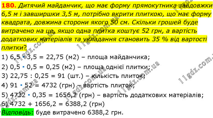 Дитячий майданчик, що має форму прямокутника завдовжки 6,5 м і завширшки 3,5 м, потрібно вкрити плиткою, що має форму квадрата, довжина сторони якого 50 см. Скільки грошей буде витрачено на це, якщо одна плитка коштує 52 грн, а вартість додаткових матеріалів та укладання становить 35 % від вартості плитки? 1) 6,5 ∙ 3,5 = 22,75 (м2) – площа майданчика; 2) 0,5 ∙ 0,5 = 0,25 (м2) – площа однієї плитки; 3) 22,75 : 0,25 = 91 (шт.) – кількість плиток; 4) 91 ∙ 52 = 4732 (грн) – вартість плиток; 5) 4732 ∙ 0,35 = 1656,2 (грн) – вартість додаткових матеріалів; 6) 4732 + 1656,2 = 6388,2 (грн) Відповідь: буде витрачено 6388,2 грн.